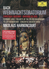 L’oratorio de Noël, capté en 1981 par Unitel à Waldhausen dans la Stiftskirche, est très différent du double DVD de John Eliot Gardiner. Nikolaus Harnoncourt se veut plus majestueux et plus tonitruant aussi. Sans doute à tort. De plus, l’idée de faire chanter plusieurs airs par des enfants se révèle périlleux dans le sens où leur interprétation est plus appliquée, voire carrément défaillante et laborieuse par moment. Heureusement (et malheureusement par comparaison), il y a le ténor Peter Schreier et la basse Robert Holl en tous points excellents. La direction d’orchestre de Nikolaus Harnoncourt (tel un grand prêtre car il faut le voir habillé de noir et en col blanc diriger son orchestre en écarquillant les yeux) est aussi nettement plus lente. Il se rattrape dans les passages du chœur où il fait preuve d’un plus grand dynamisme. La réalisation du DVD se veut elle aussi majestueuse mais cette fois-ci Unitel, qui se donne des moyens quasi cinématographiques, se fait plus kitsch qu’à l’ordinaire. Souvent, pour éviter de rester focalisé sur les chanteurs ou sur l’orchestre, sont intercalées des images de crèche, de statues… Sans oublier qu’il y a dans le fond de grands arbres de Noël décorés de guirlandes… Tout cela a un côté un peu cliché, voire un peu mièvre dans la représentation. Je sais bien que nous sommes dans un oratorio de Noël, mais justement… Yannick Rolandeau |