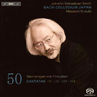 Cinquantième volume de l’intégrale des Cantates de Jean-Sébastien Bach. Au programme, quatre partitions de la période de Leipzig (1726-29). « Nous chantons avec la joie de la victoire » BWV 149, « Je vis, mon cœur » BWV 145, « J’aime le Très-Haut de toute mon âme » BWV 174, et « Je vais et cherche en te réclamant » BWV 49. Masaaki Suzuki et le Collegium Japan se livrent ici à un « aménagement » de trois cantates BWV 149, 145, 174 pour lesquelles nous vous invitons à vous reporter aux commentaires du chef d’orchestre japonais dans le livret d’accompagnement de l’enregistrement. Bien évidemment cette interprétation demeure d’une hauteur de vue unique, que le temps rendra encore plus indispensable. A savourer.
