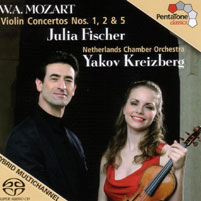 Datant de 1773, le premier concerto pour violon de Mozart est le fruit de son voyage en Italie où il mena une tournée triomphale. Le second concerto fut composé deux ans plus tard en 1775 et "semble presque revenir un pas en arrière. L'oeuvre respire l'atmosphère de l'élégante musique de la Cour telle que l'on peut également l'entendre dans ses sérénades". Le cinquième concerto pour violon "alla turca" est, quant à lui, d'une facture plus élaborée faisant du duo violon/orchestre un véritable dialogue avec échange et développement. Second volume de l'intégrale des Concertos pour violon de Mozart du label Pentatone, ce Super Audio CD regroupe les opus K.207, K.211, K.219. Julia Fischer, accompagnée par l'orchestre de chambre néerlandais que dirige Yakov Kreizberg, enchante une nouvelle fois par des phrasés d'une grâce absolue. Elle délivre un discours musical, à la fois naturel et coloré, offrant ainsi une approche sereine de ces partitions virtuoses. Avec cet enregistrement, dans lequel elle signe toutes les cadences, la jeune violoniste allemande démontre, une nouvelle fois, son amour passionné de la musique.