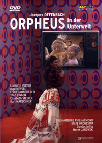 Allez-vous résister ? Arthaus Musik ressort en DVD plusieurs représentations datant des années soixante dix. Après Les Noces de Figaro par Hans Schmidt-Isserstedt enregistré en 1967 et en couleurs, voici Orphée aux enfers de Jacques Offenbach donné en 1971 sous l’égide du compositeur et directeur de théâtre Rolf Liebermann qui dirigea le théâtre du Staatsoper de Hambourg. Hélas, avec un côté post-soixante-huitarde, post-hippie, c’est invisible. Au début, j’ai cru qu’il s’agissait d’une nouvelle production moderniste avec un côté rétro. Mais pas du tout, il est bien question d’une production de Rolf Liebermann, donc ancienne. On réalise que ces productions chargés de « dépoussiérer » d’anciens opéras se ressemblent, reposent sur un même moule qu’il s’agit de promouvoir avec malice, et sont proprement poussiéreux plus de trente ans après. C’est dire si le concept n’est pas nouveau et a fait un retour en force ces dernières années. Ici, tout est outré, kitsch (je ne vous parle même pas des décors en toc et des costumes d’un parfait mauvais goût au point qu’on a l’impression d’être dans une sorte de nougat pendant près de deux heures), vulgaire, et tout est fait pour vous provoquer et vous soulever le coeur. Seul point notable, une certaine vitalité dans les interprètes et William Workman en Pluton, Elisabeth Steiner en Eurydice, Regina Marheineke en Diane, Toni Blankenheim en Jupiter, Kurt Marschner en Orphée s’en sortent avec un certain panache. Marek Janowski, lui aussi, dirige avec une grande vivacité mais vraiment, pour le reste, un vrai four. Faire un tel sort à cette opérette, c’est purement et simplement la tuer.